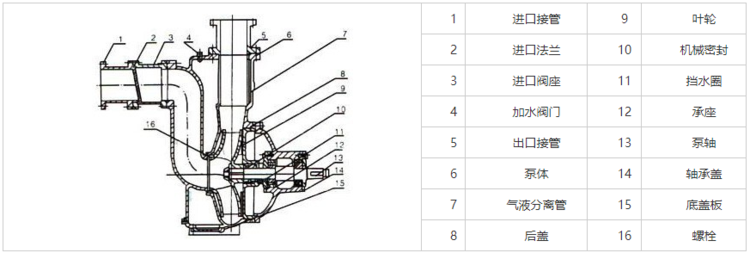 ZW型自吸排污泵主要由泵體, 葉輪、后蓋、機(jī)械密封、泵軸、軸承座、進(jìn)口閥、氣液分離管、加水閥門、進(jìn)、排接管等組成。泵的結(jié)構(gòu)見圖。 泵的工作原理:泵體內(nèi)設(shè)有儲液腔,并通過上方的回流孔和下方的循環(huán)孔與泵工作腔相通,構(gòu)成泵的軸向加流外混式系統(tǒng)。泵停止工作后,泵內(nèi)腔已儲有一定容積的液體。當(dāng)泵起動時,有關(guān)當(dāng)局內(nèi)的儲液在葉輪的作用下,夾帶著空氣被向上拋出,液體通過氣液分離管的網(wǎng)格回流到工作腔,氣體被排出泵外,使泵內(nèi)形成一定的真空度,達(dá)到自吸的作用。  自吸排污泵結(jié)構(gòu)圖:
